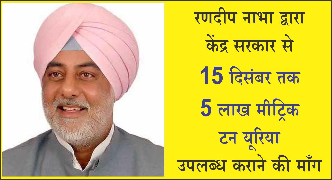 रणदीप नाभा द्वारा केंद्र सरकार से 15 दिसंबर तक 5 लाख मीट्रिक टन यूरिया उपलब्ध कराने की माँग